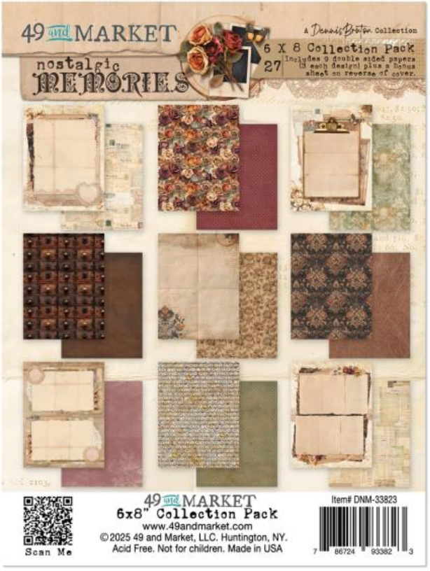 "Capture your precious moments with the exquisite Nostalgic Memories 6x8 Collection Paper Pack designed by Dennis Bruton for 49 and Market. This collection embodies timeless elegance, offering a beautiful array of double-sided, heavy-weight cardstock papers featuring vintage-inspired patterns, soft color palettes, and intricate details.Perfectly sized for mini-albums, card making, memory keeping, and other paper crafting projects, this pack is the foundation for creating cherished keepsakes with a classic, sophisticated flair. Let your creativity bloom with designs that evoke the warmth and beauty of yesteryear."