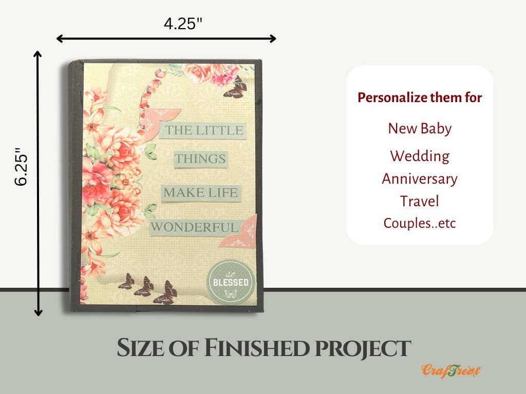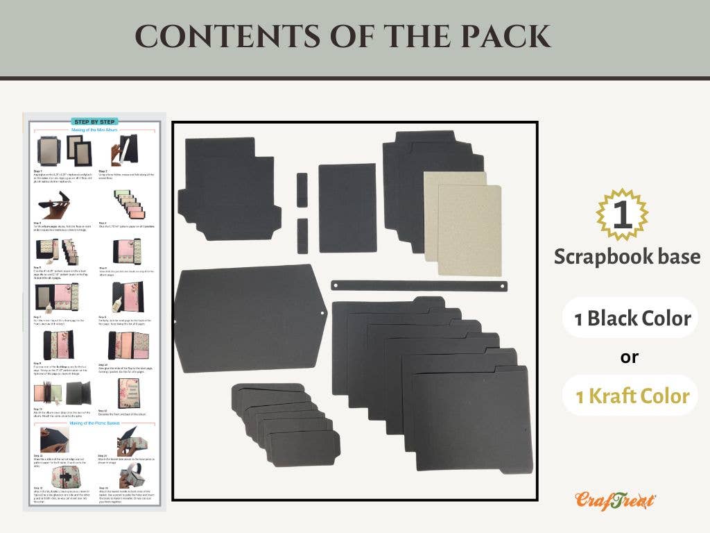 1 set: Black Make quick and easy scrapbooks. Stick the photos you like Personalize them with colorful patterned sheets, embellishments, and stickers. Fill it with memories, photographs, and thoughts. Picnic Basket Mini Kit contains pre-cut bases for 1 set of 7.25"x 5.25" baskets, a 4.25 X 6.25"interactive album with Pages, pockets, tags, and special binding, and 1 Black.