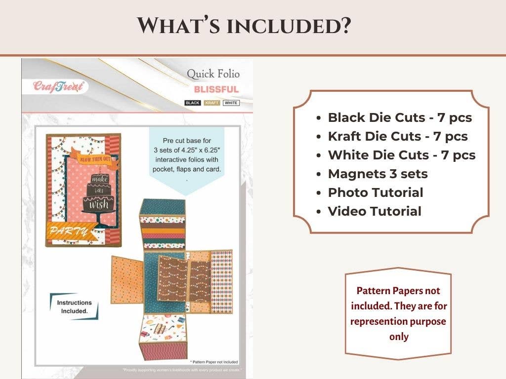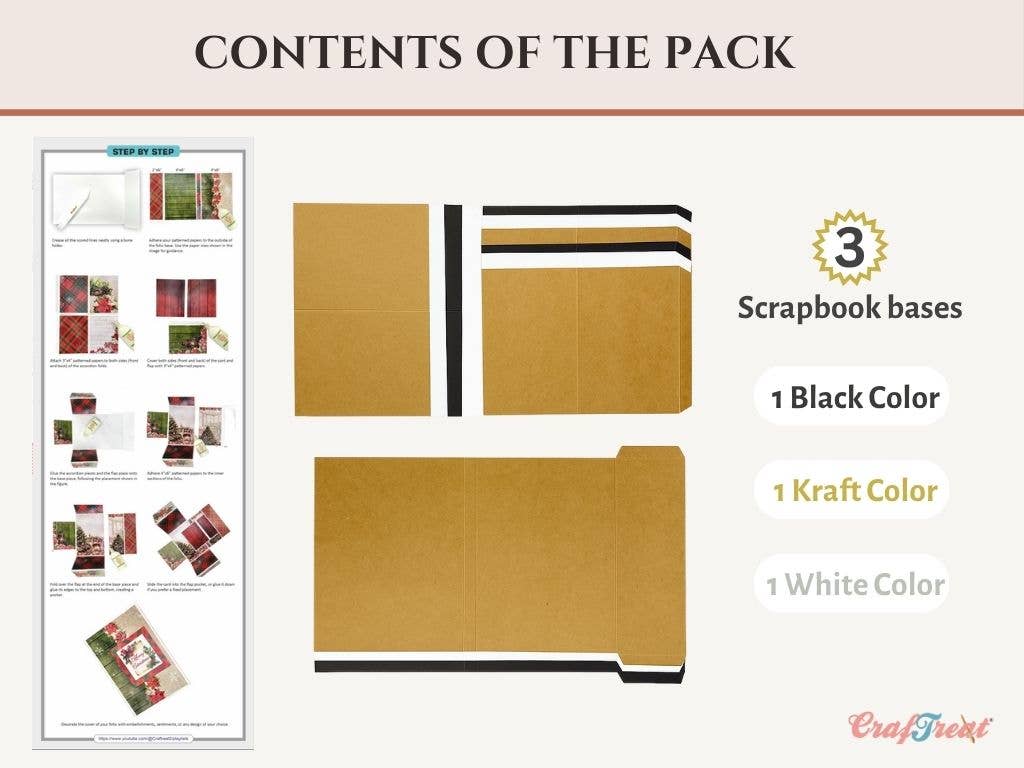 Blissful Folio - Features a long pocket on the right, in which tags and cards can be inserted. On the left side opens 2 accordions and a flap to reveal the centre. * Includes 3 Folio Bases - Black / Kraft / White * Finished Size: 4.25”x6.25” * Recommended Paper Size: 6”x6” Pre-cut and pre-scored, these sturdy bases make album-making quick and easy. Simply add your favorite papers, embellishments and photos to create a stunning keepsake. Detailed instructions included. No more crooked measuring/cutting or guesswork. Take the stress out of scrapbooking with Folio and Scrapbook blanks! Save time and achieve professional results! Customize it to any theme!