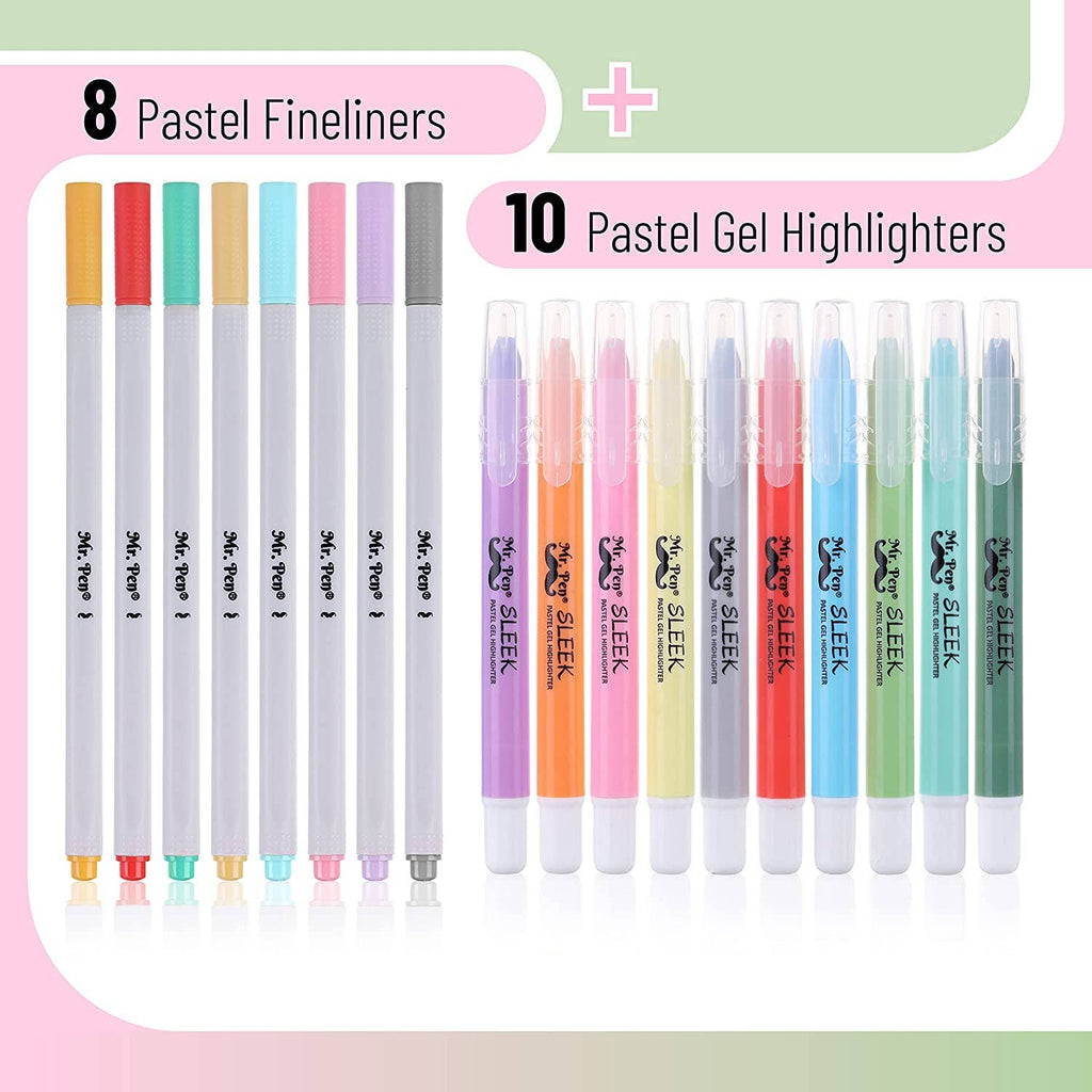 Package includes 8 fineliner pens and 10 highlighters in beautiful pastel colors.
