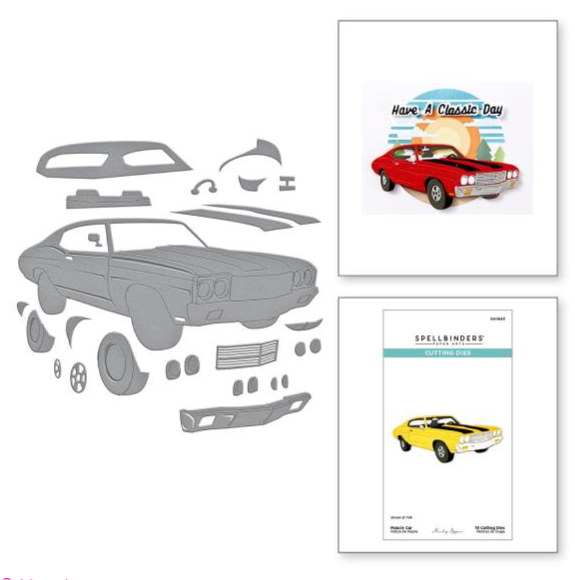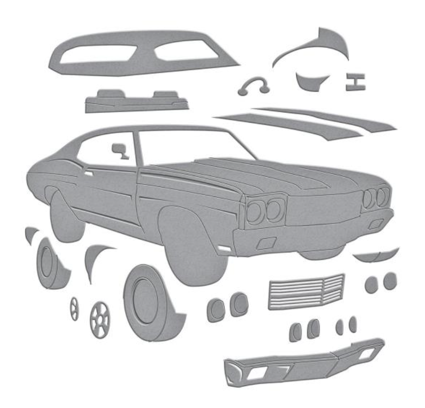 Muscle Car Etched Dies are part of the Classic Road Legends Collection by Mindy Eggen. Assembled, this set of 15 thin metal cutting dies bring a classic muscle car to life! A fun car that leads us on the open road for lots of adventures. The finished car measures approximately 4.71 x 2.08 in./12.00 x 5.30 cm.Cruise into some nostalgic vibes with the Classic Road Legends Collection by Mindy Eggen! Her debut collection with Spellbinders is perfect for classic car fans and those hard to create masculine projects.