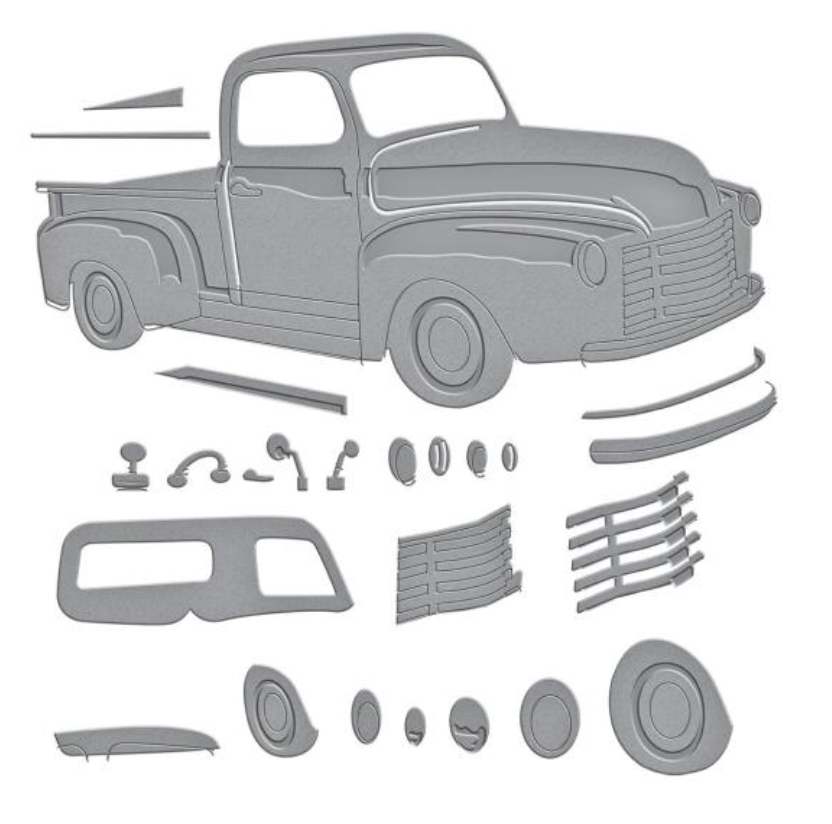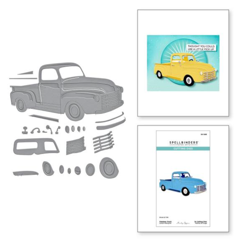 Timeless Truck Etched Dies are from the Classic Road Legends Collection by Mindy Eggen. Assembled, this set of 14 thin metal cutting dies brings this iconic pickup truck to life! It transports you to simpler times and evokes memories of fun road tripseven going down the street is an adventure! The finished truck measures approximately 4.70 x 2.47 in./11.90 x 6.30 cm.Cruise into some nostalgic vibes with the Classic Road Legends Collection by Mindy Eggen! Her debut collection with Spellbinders is perfect for classic car fans and those hard to create masculine projects.