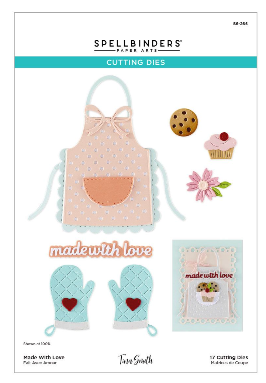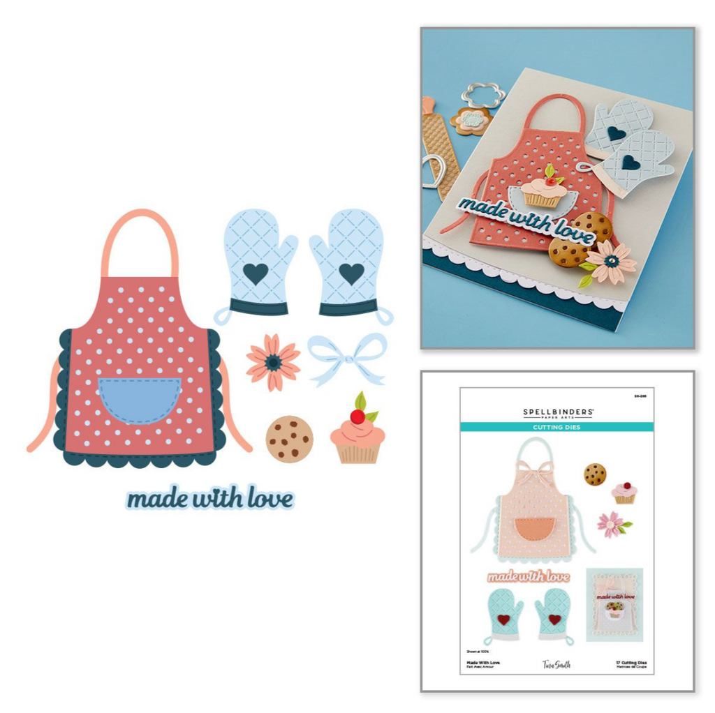 Made With Love Etched Dies are from the Make It & Bake It Collection by Tina Smith. How adorable is this apron? The set of 17 thin metal cutting dies creates a sweet dotted apron and matching oven mitts! It also includes a cupcake, a flower and the Made with Love sentiment with its outline. Use as a set to create a card or mix and match with the others in the collection. This offering from Tina Smith creates freshly baked happiness through a combination of tools, equipment, sentiments and even a sweet apron set. What project will you whisk up with the Make It & Bake It Collection?