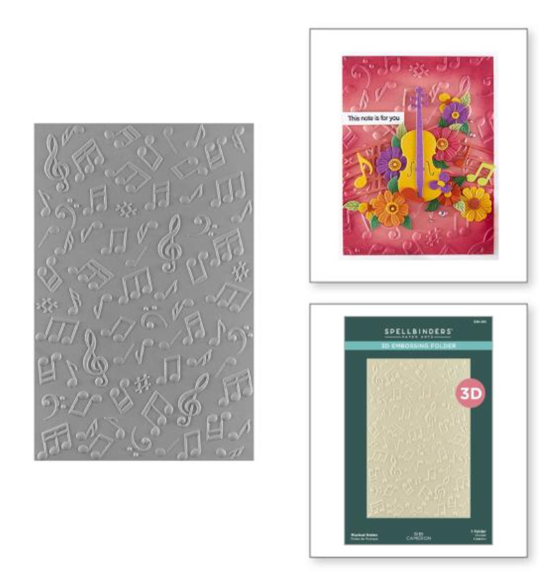 Musical Notes 3D Embossing Folder is a 5.50 x 8.50-inch embossing folder with a wonderful background filled with musical notes designs. What a fabulous backdrop to mix and match with the other sets in this collection!This versatile 3D Embossing Folder can texturize the surface of various card sizes from A2-size (4.25 x 5.5-inch) to a Slimline Size (3.5 x 8.5-inch). For the most detailed impression, lightly mist the cardstock with water before embossing.This is not just your ordinary embossing folder! 3D Embossing Folder shape and sculpt paper into amazing works of art. Transform cardstock, patterned paper, vellum and more into stunning textured elements to bring your project up a level.How to Build a 3D Embossing Folder Sandwich:From the Bottom, place Platform Base (A), add 3D Embossing Folder with Paper Inside, and top with Adapter Plate (D). Roll the Sandwich through your Spellbinders Platinum Machine. Make sure the folder with the open end goes in first for a smooth embossing